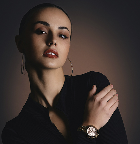 Ювелирные украшения здесь — ключевые акценты. Лаконичные кожаные браслеты с металлом, геометричные кулоны или серьги с динамичными линиями. Черный фон идеально оттеняет их выразительность, создавая гармоничный образ для активной жизни.