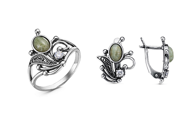 Крупные вставки из везувиана в ажурной оправе обращают нас к классическим ювелирным традициям - такие украшения напоминают о стиле прошлых поколений, когда природная красота камня и солидность размера ценились особенно высоко. Этот вечный тренд на натуральность и величие в ювелирном искусстве продолжает оставаться актуальным, подчеркивая нашу неразрывную связь с природой.