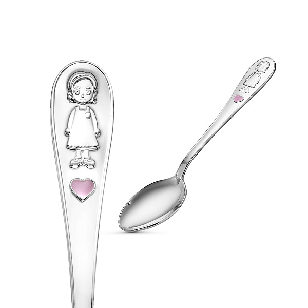 Детская серебряная ложка с изображением девочки и сердца декорированного эмалью розового цвета. Идеальный подарок для любимого малыша.